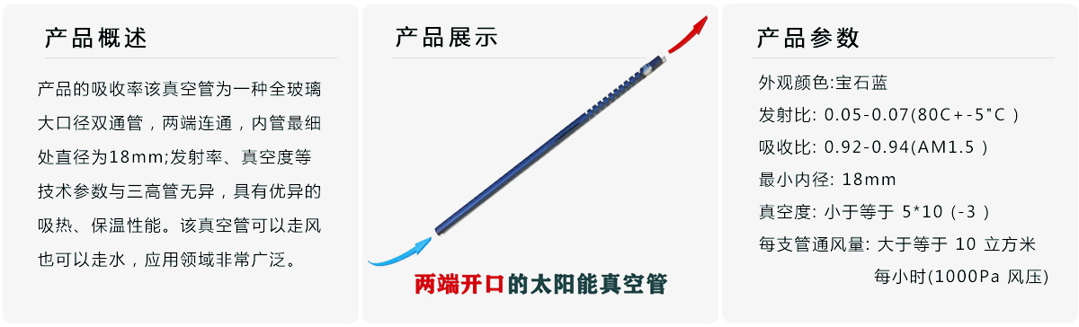 玻璃太陽能雙通管是兩端開口的太陽能真空管。該產(chǎn)品的出現(xiàn)顛覆了很多領(lǐng)域太陽能的應用模式,通過該產(chǎn)品可很容